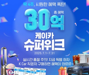 케이카가 여름 성수기를 맞아 총 30억원 규모의 파격적 혜택을 제공하는 프로모션을 펼친다. 국내 최대 직영중고차 플랫폼 기업 K Car(케이카)는 가격 할인, 무료 배송, 보증 무료 등 풍성한 혜택을 제공하는 'K Car 슈퍼위크'를 31일까지 한 달간 진행한다고 2일 밝혔다.