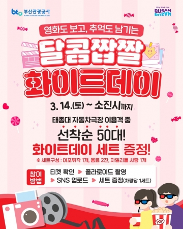 부산관광공사(이하 공사)는 오는 3월 14일(토) 화이트데이를 맞아 태종대 자동차극장을 찾는 관람객을 대상으로 특별 이벤트를 운영한다고 밝혔다.