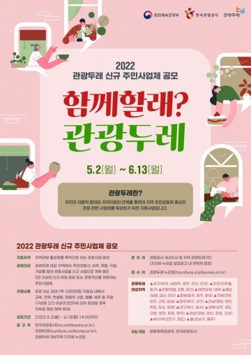 문화체육관광부(장관 황희)와 한국관광공사(사장 안영배)는 주민이 만들어나가는 지속가능한 지역관광 생태계를 조성하고자 2022년 관광두레 신규 주민사업체를 5.2.~6.13. 기간 동안 공모한다.