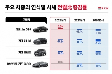 주요 모델의 시세 변동률을 살펴보면 제네시스 G80(RG3) 시세는 2022년식이 전월보다 0.5% 상승할 전망이다. 반면 2021년식은 0.4%, 2020년식은 1.0%씩 각각 전월 대비 하락할 전망이다. 기아 카니발 4세대의 경우 2022년식은 전월 대비 시세가 0.2% 하락이 예상된다. 2021년식(0.5% 하락)이나 2020년식(1.4% 하락)과 비교해도 시세 하락 예상폭이 작다.