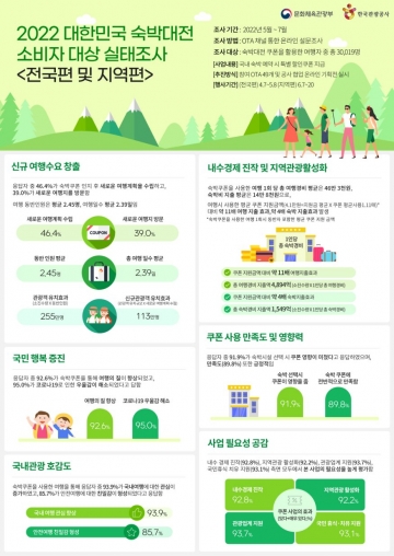 문화체육관광부(장관 박보균)와 한국관광공사(사장직무대행 신상용)가 추진한 숙박할인쿠폰 지원사업 ‘2022 대한민국 숙박대전’이 8,946억 원의 생산유발효과 등 경제파급효과를 불러온 것으로 나타났다.